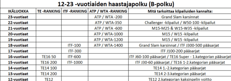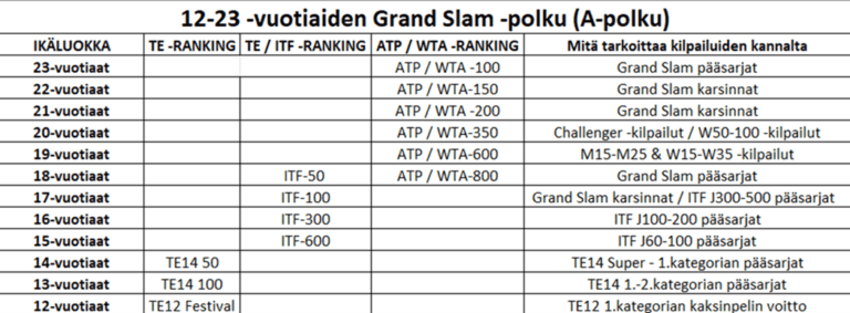 TATS akatemia jaetaan pikkuakatemiaan sekä grand slam- ja haastajapolkuihin. Valmennusjohto valitsee pikkuakatemiaan U11-pelaajat, jotka nähdään potentiaalisina pelaajina muille akatemiapoluille myöhemmissä ikävaiheissa. Kokonaisarviossa otetaan huomioon pelaajan taso ja menestys, arvioitu urheilijapotentiaali, päivittäinen harjoitusasenne, kilpailuaktiivisuus sekä perheen sitoutuminen kansainvälisen polun vaatimuksiin. Alla kriteerit U12-23-vuotiaiden pelaajien akatemiapoluille, jotka ovat linjassa Tennisliiton määrittelemien polkujen kanssa: